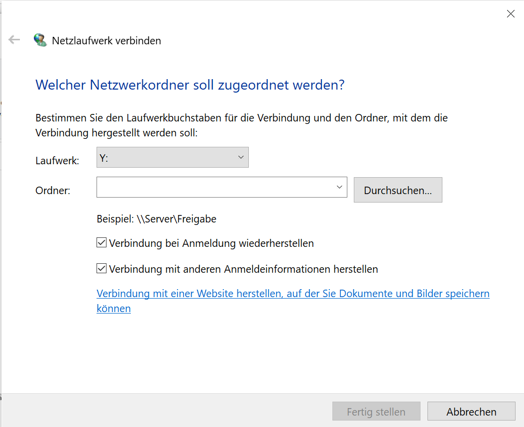 B: Persönlichen Link einfügen in das Feld "Ordner" einfügen. Den Buchstaben für das Laufwerk könnt ihr beliebig auswählen: